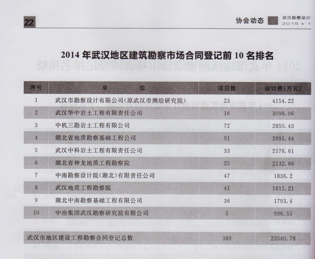 根據(jù)武漢市勘察設(shè)計協(xié)會出版的《武漢勘察設(shè)計》雜志2015年第一期刊登的最新統(tǒng)計,武漢市勘察設(shè)計有限公司2014年全年的勘察合同登記總金額達(dá)到4154.22萬元,再次名列武漢地區(qū)第一名。我公司在2012、2013、2014年已連續(xù)三年位居武漢地區(qū)建筑勘察市場合同登記前10名排名的榜首。 (綜合部)