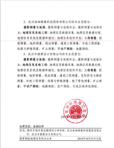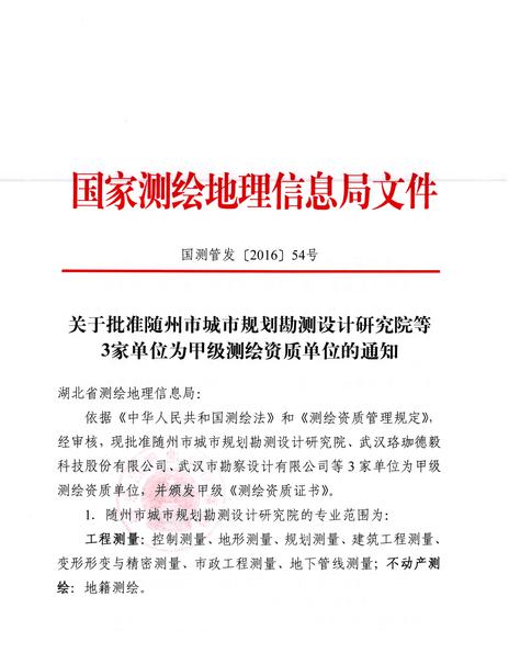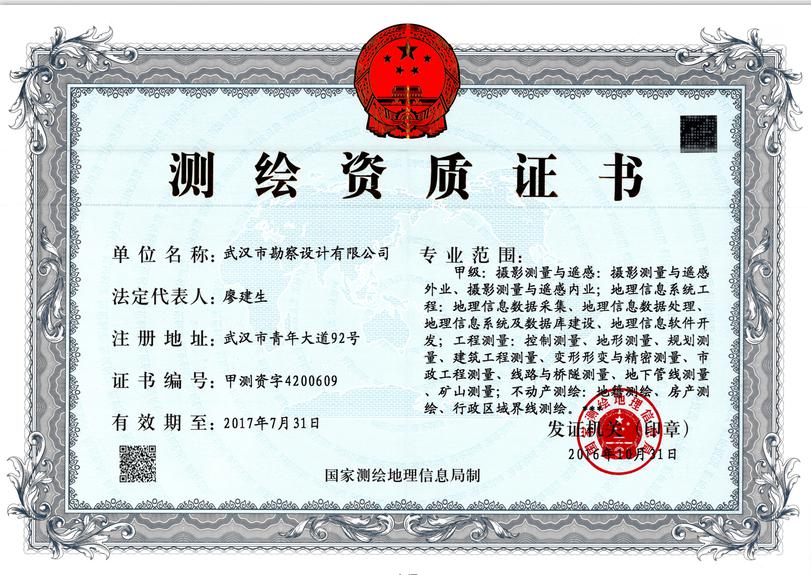 日前,經(jīng)湖北省測繪地理信息局審查推薦、國家測繪地理信息局審核批準(zhǔn),武漢市勘察設(shè)計(jì)有限公司榮獲甲級測繪資質(zhì)證書。自此我公司甲級測繪業(yè)務(wù)將全面覆蓋攝影測量與遙感、地理信息系統(tǒng)工程、工程測量、不動產(chǎn)測繪等專業(yè)范圍。