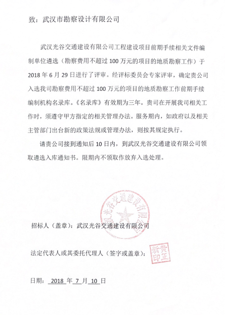 2018年6月29日,經(jīng)投標(biāo),我公司成功入選武漢光谷交通建設(shè)有限公司勘察費(fèi)用不超過(guò)100萬(wàn)元的項(xiàng)目地質(zhì)勘察工作,服務(wù)期限為三年。 武漢光谷交通建設(shè)有限公司主要業(yè)務(wù)范圍為城市地鐵、有軌電車(chē)、公交系統(tǒng)等公共交通項(xiàng)目的建設(shè)、運(yùn)營(yíng)管理;重大交通建設(shè)項(xiàng)目、重大...